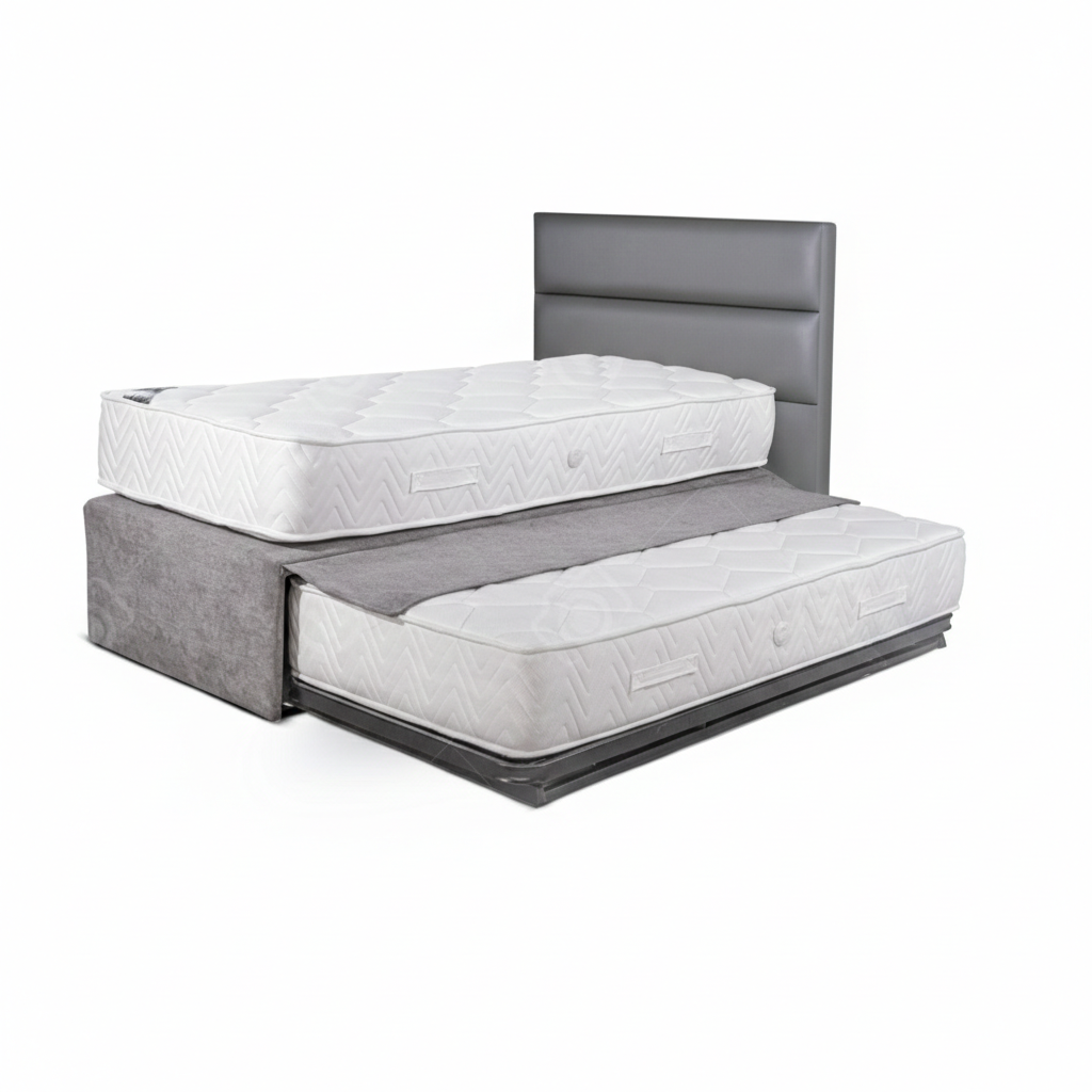 מיטת יחיד עם ראש נפתחת עם מנגנון שליפה והרמה על-קל, עם מזרני קפיצים אורטופדיים.